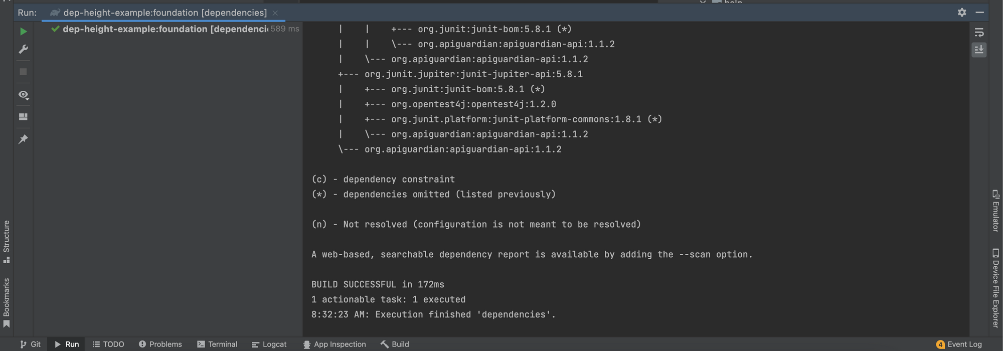 - After this task finishes executing it will print the whole dependency tree report in the console of Android Studio.