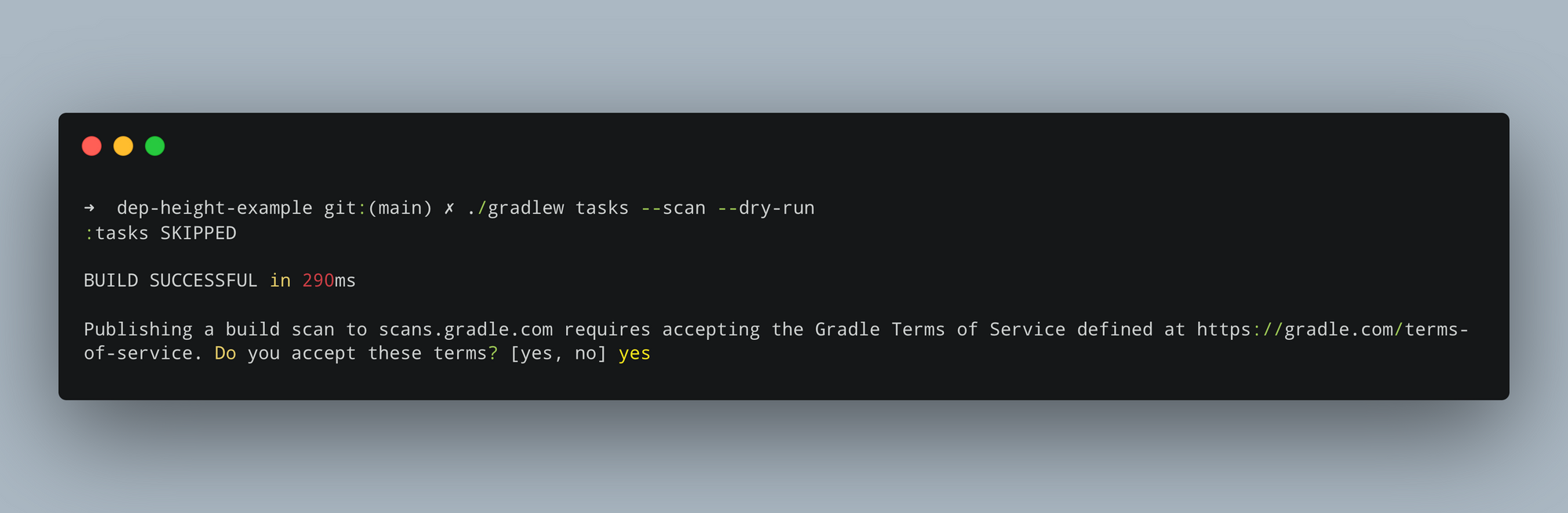 Once the build ends, you will be prompted for a confirmation to generate the build scan. This is because Gradle will be collecting build information and information about your hardware and sending it to their servers.